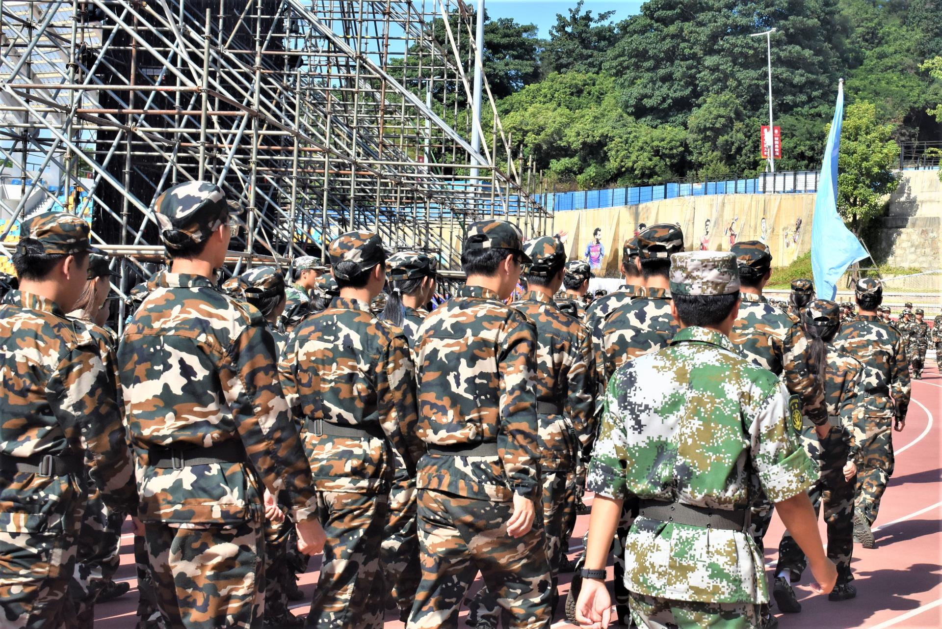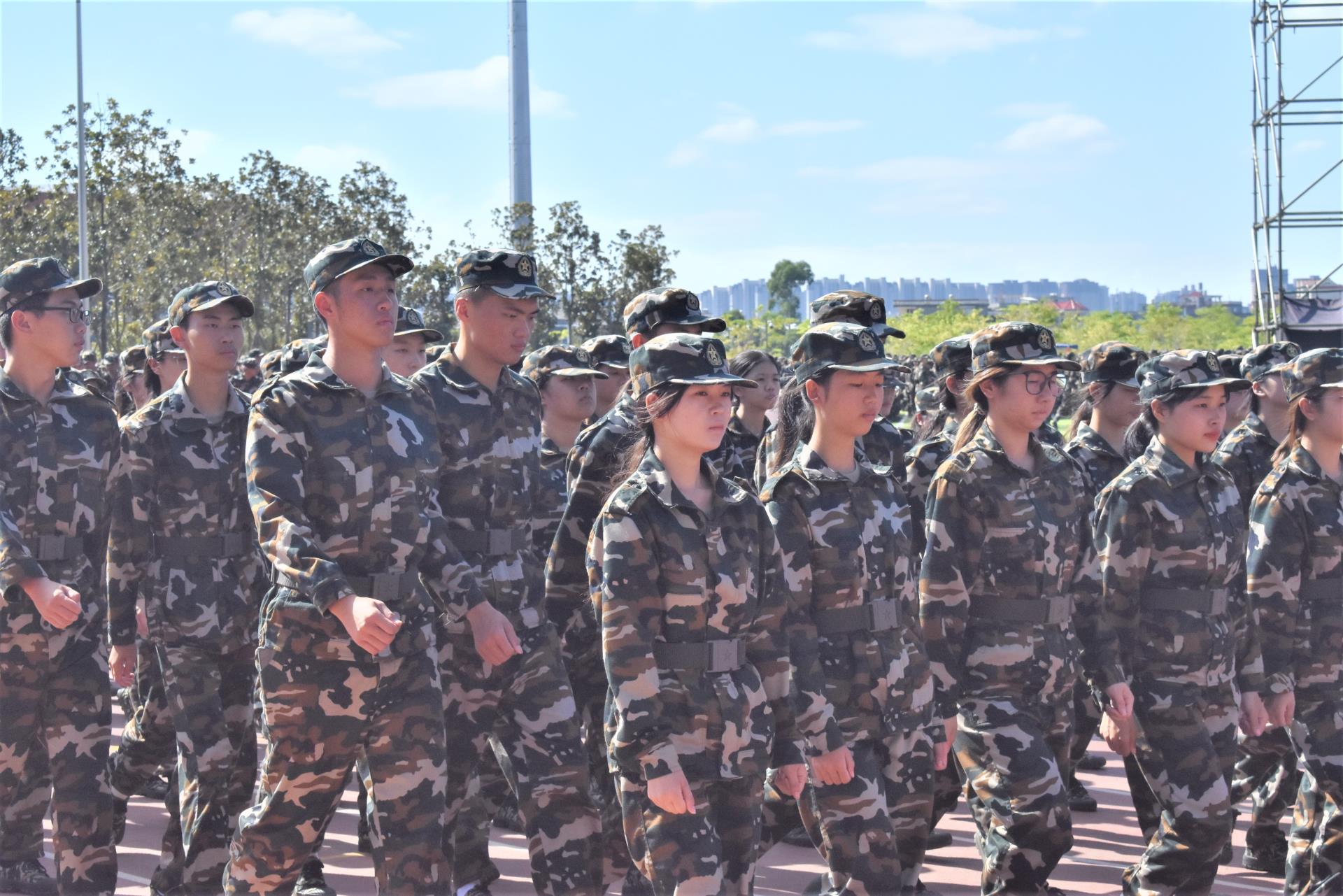 在教官的带领下,同学们都迈着整齐有力的步伐走到操场上,有序地等待彩排的开始,在这期间大家不敢有丝毫的放松。伴随主持人的介绍,我系22级学子穿着迷彩服迎面走来。一招一式、一脚一步,背后都是教官不停的研究和琢磨,每一个动作都是同学们辛苦几倍的训练成果。同学们目视前方,踏着整齐、坚定而又自信的脚步,严谨有序地接受检阅。此次彩排的具体项目有千人字针、擒敌拳、刺杀操等多项内容。每个项目彩排都非常的精彩,这让许多人也期待最终正式的汇报演出。