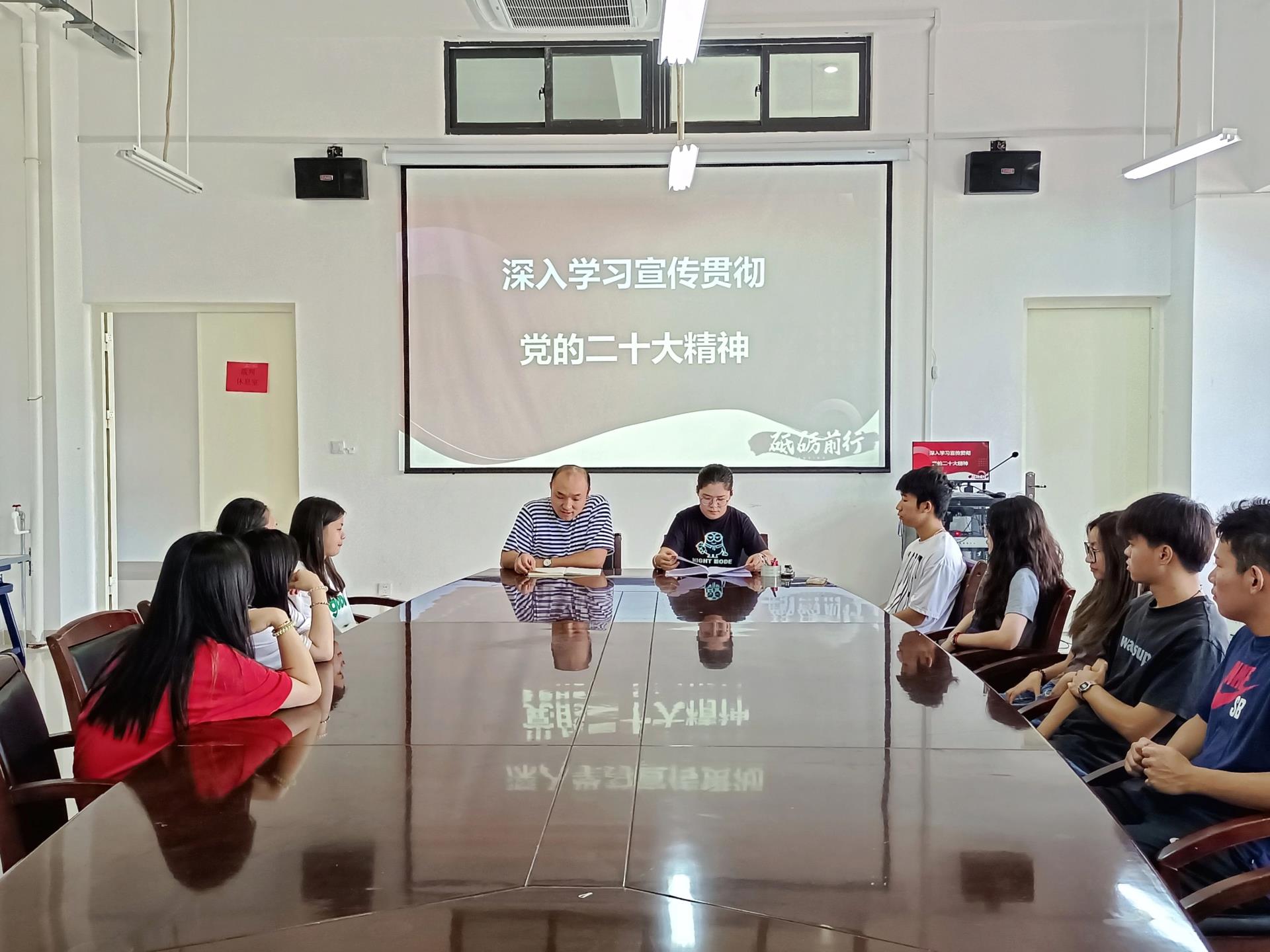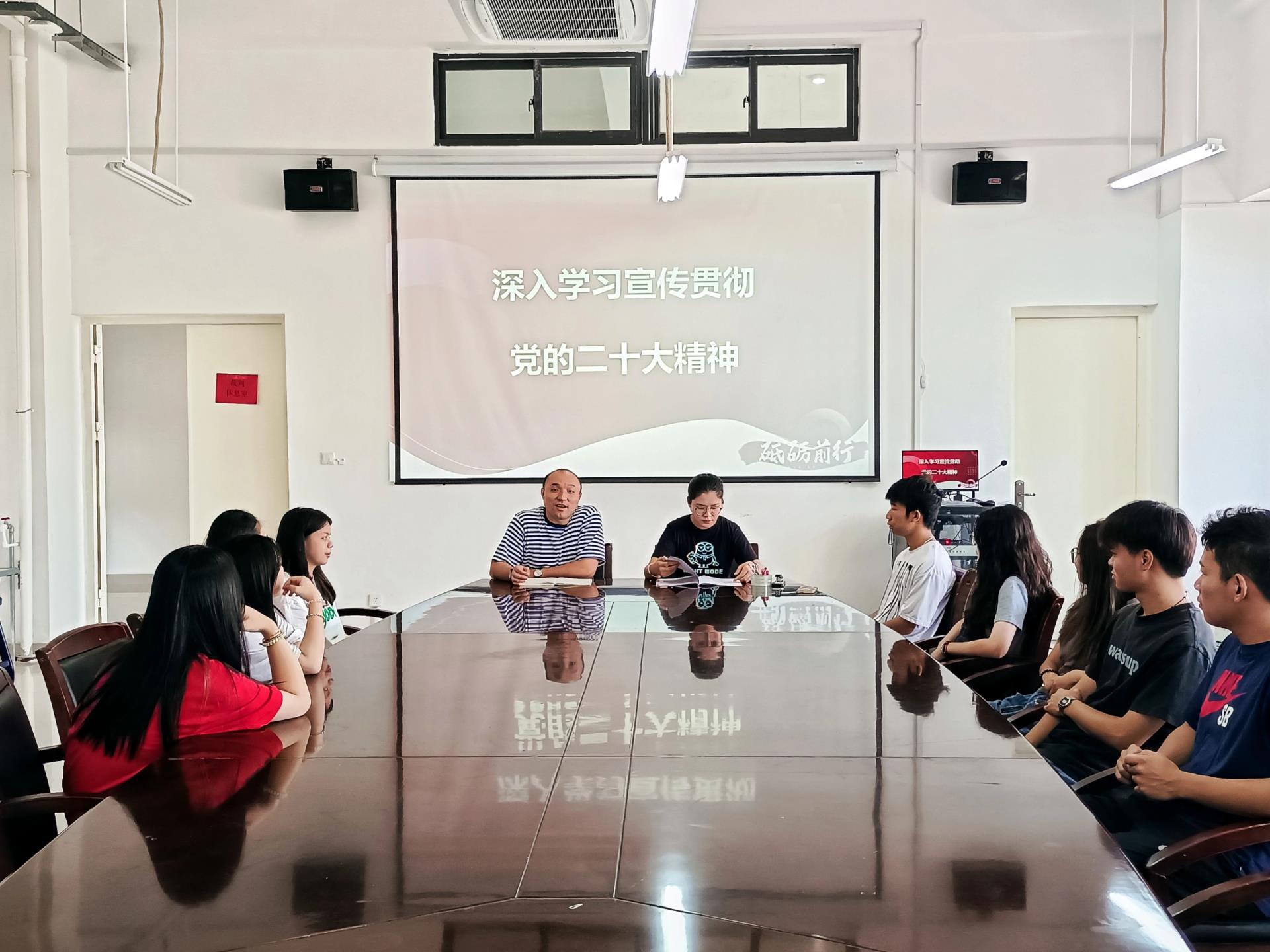 翁东旭辅导员结合具体事例,将党的二十大精神对于青年学生的要求做了深入浅出的讲解,勉励同学们将党的二十大精神内化于心,外化于行;罗茂林辅导员带领同学们观看了党的二十大热点视频并引导同学们要以党的二十大为指引,沿着党的奋斗足迹,努力成为能担当民族复兴大任的时代新人;蔡梦杭辅导员亲自带头,带领同学们学习了党的二十大热议文章和报道,并与同学们深入交谈,鼓励大家畅所欲言,在交流中深入领悟党的二十大精神。蔡梦杭辅导员告诉大家:同学们生逢盛世未来可期,希望大家用心体会党的二十大精神,树立坚定的理想信念,矢志不渝听党话、跟党走,把握大好的学习时光,切实做到学用结合,把个人理想追求融入民族复兴伟大征程,为全面建设社会主义现代化国家贡献青春力量。