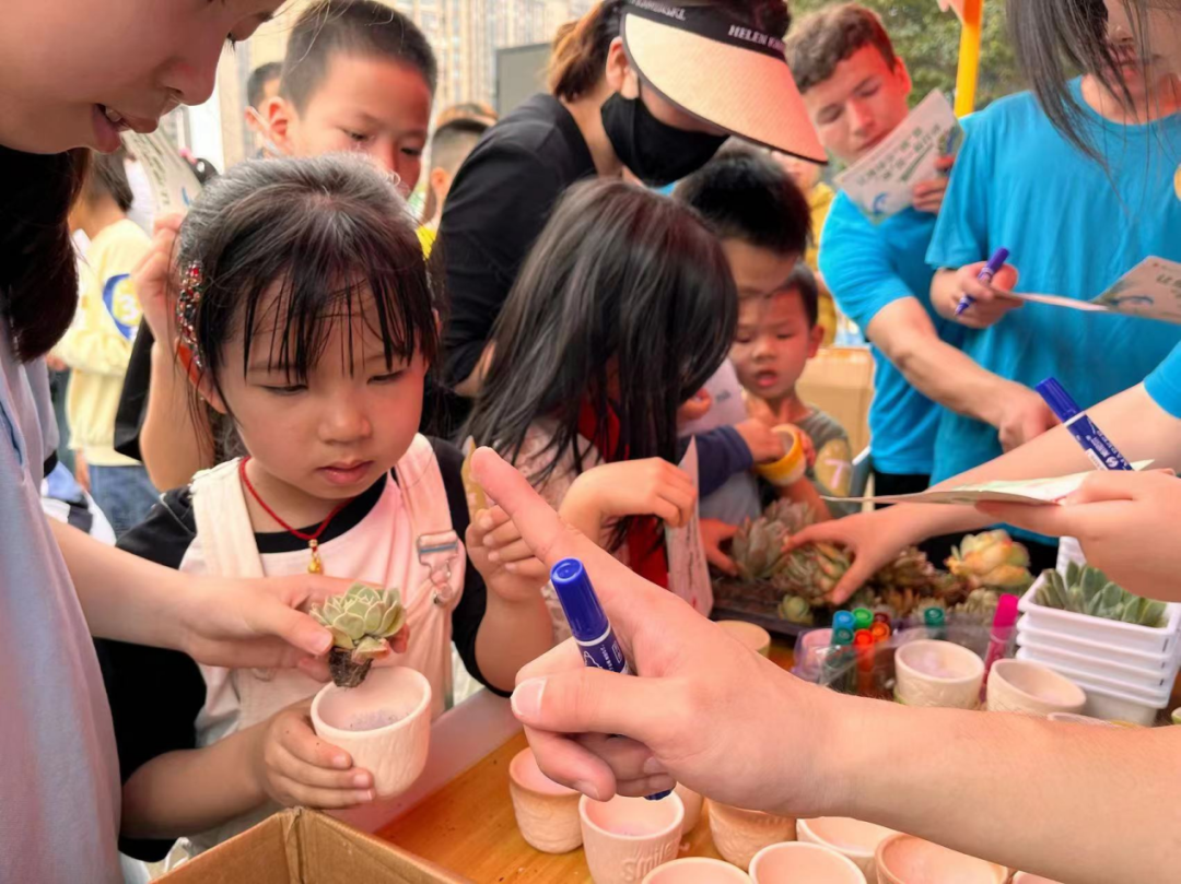在旧物交换摊位,参与活动的家长孩子们根据自己的需求和喜好挑选环保香片、主题杯等进行以物换物。不仅如此,他们还可以通过打卡现场各个摊位的活动领取咖啡渣等环保肥料,兑换绿植,种下环保希望,将绿色带回家。