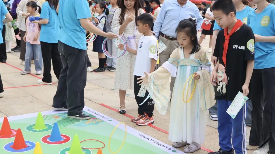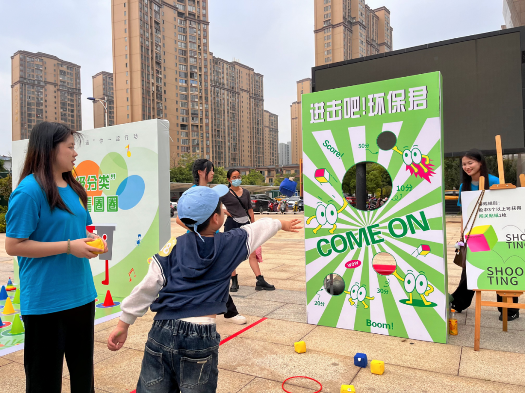“大手拉小手”垃圾分类知识科普区,湄职院“湄小筑”志愿服务队的志愿者们化身“环保”卫士,在现场设置“接地气”的垃圾分类主题闯关,以垃圾分类小知识对应开展环保投篮、套圈、丢沙包等趣味互动活动,让孩子们在趣味玩乐中掌握分提升垃圾分类意识,加强对垃圾分类知识深刻理解。