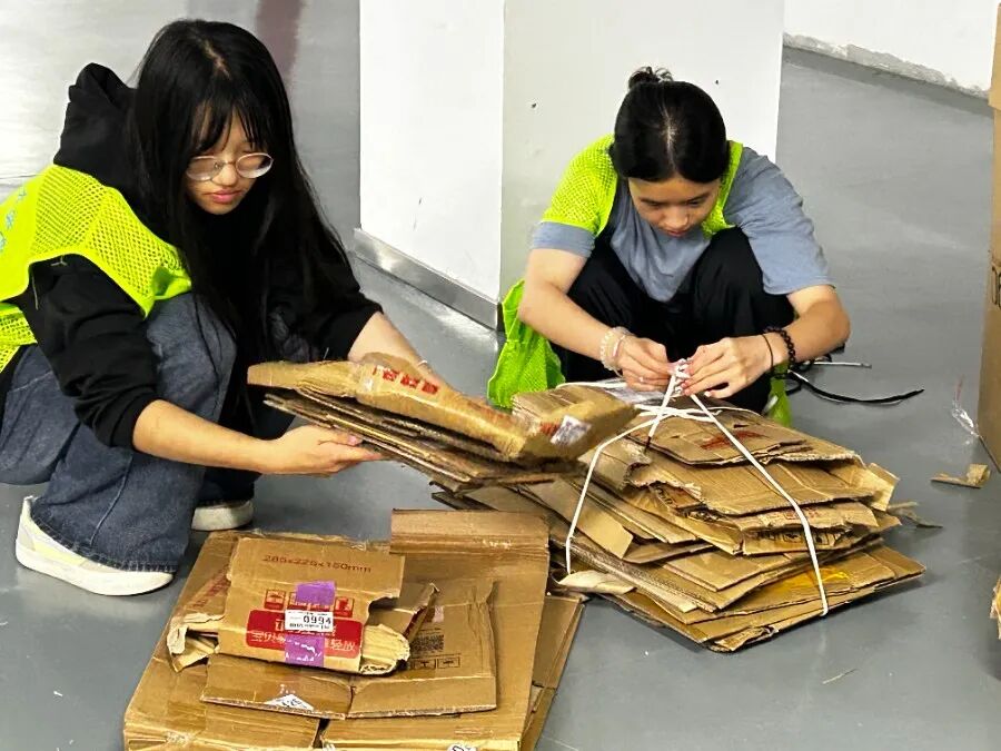 垃圾投放结束后,志愿者们全力投入后续整理工作。大家分工协作,对回收垃圾进行二次分拣,将纸皮制品逐一拆解、压平并捆绑,最大限度节省储存空间;同时将铁制品、铝制品等金属垃圾集中归类,确保各类垃圾规范处置。