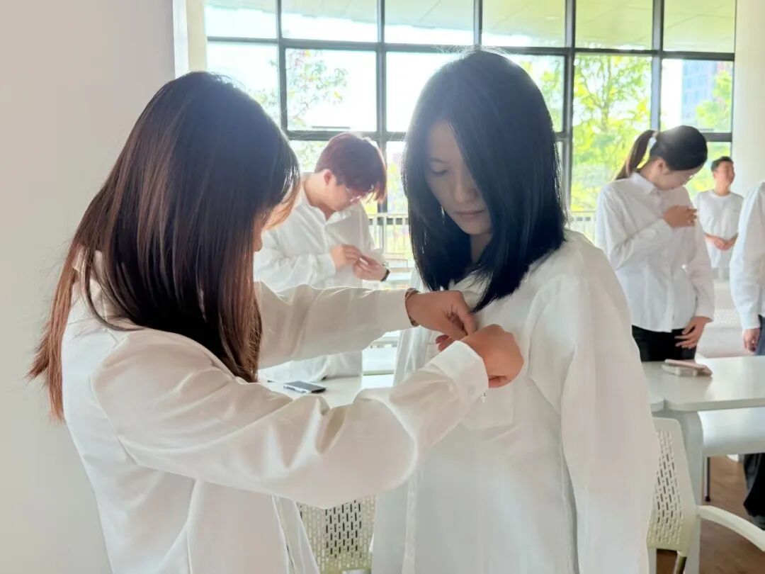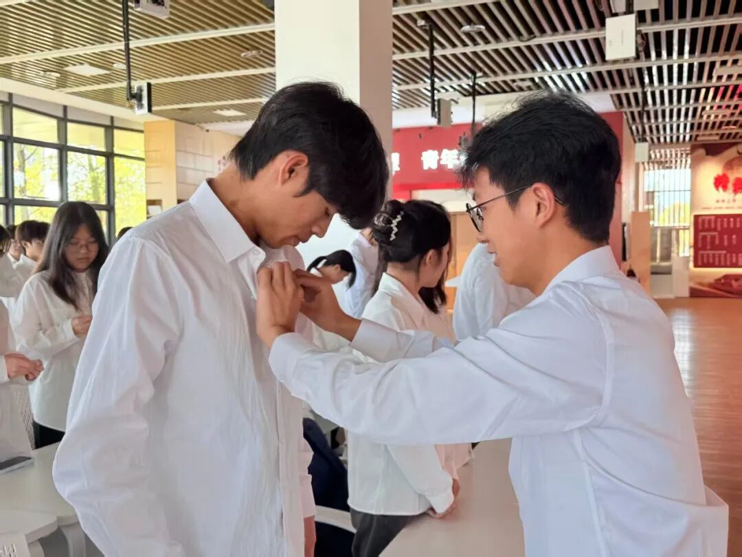 仪式由系分团委副书记谢安琪主持。在肃穆的氛围中,她首先宣读了新团员名单。随后,各班级团支书上前,为新团员逐一佩戴上闪耀的团徽。这枚徽章不仅是身份的象征,更意味着沉甸甸的责任与担当。