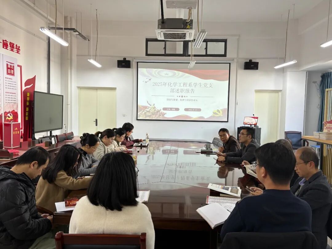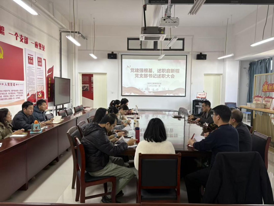为深入贯彻落实新时代党的建设总要求,进一步压实党支部书记抓党建第一责任人职责,提升基层党建工作质量,化学工程系党总支于2026年1月13日组织召开2025年度党支部书记述职评议考核会议。系全体党员参加会议。会议采取“述、评、测、结”相结合的方式,全面检视年度党建工作成效,谋划新一年发展蓝图。