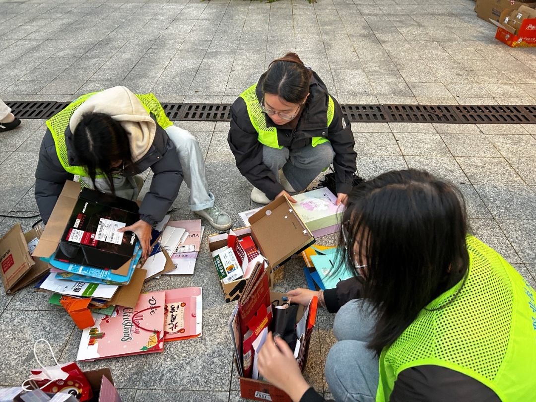 完成分类后,志愿者们立即开始进行整理与捆扎。志愿者们伸直手臂,将手掌平压在纸板上,把分拣好的物料捆扎整齐。纸板内部发出细碎连续的声响,边缘翘起处被一一抚平,肘部压实中央凸起部分。经反复按压,纸箱逐渐变得平整紧实。随后以膝盖抵稳纸堆,取塑料绳绕捆两圈,拉紧系牢,最后将扎实的纸捆稳步移至指定回收区。
