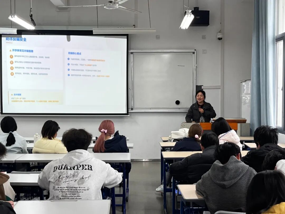 在随后的“安全第一课”环节,辅导员围绕交通、防盗、防诈骗、防火、用电、体育运动、防溺水、网络安全等多个方面,结合真实案例,系统讲解了常见安全隐患及应对措施。内容涵盖:出行遵守交通规则、宿舍防盗注意事项、警惕各类电信诈骗手段、规范用电防治火灾、运动前充分热身防伤害、远离危险水域防溺水、文明上网防范网络陷阱等。特别针对当前高发的网络诈骗,辅导员再次强调“未知链接不点击、陌生来电不轻信、个人信息不透露、转账汇款多核实”的“三不一多”原则,帮助学生提升辨别能力与防范意识,筑牢安全防线。