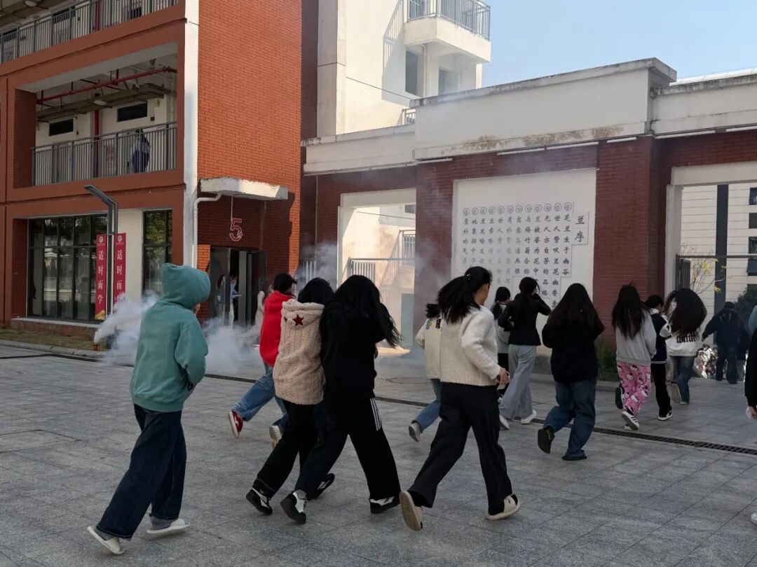 随着急促的消防警报声响起,消防应急疏散演练正式启动。全体学生迅速响应,按照预定路线,弯腰低姿、捂住口鼻,快速有序撤离“险境”。分布在楼梯转角、出入口等关键位置的安全员全程值守,实时关注人流动态,及时疏导指引,反复提醒保持间距、注意脚下,并对有需要的学生主动提供帮助。