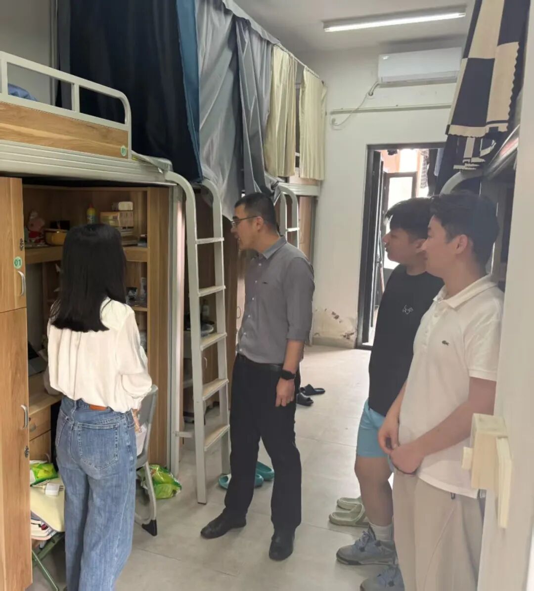 走访期间,黄林毅副书记一行重点排查了宿舍用电安全与内务卫生状况。在逐间查看过程中,他反复提醒同学们务必做到“人走断电”,严禁使用违规电器,时刻紧绷安全之弦。针对部分宿舍存在的物品杂乱、通风不畅等问题,现场提出了整改意见,并要求辅导员持续跟进。