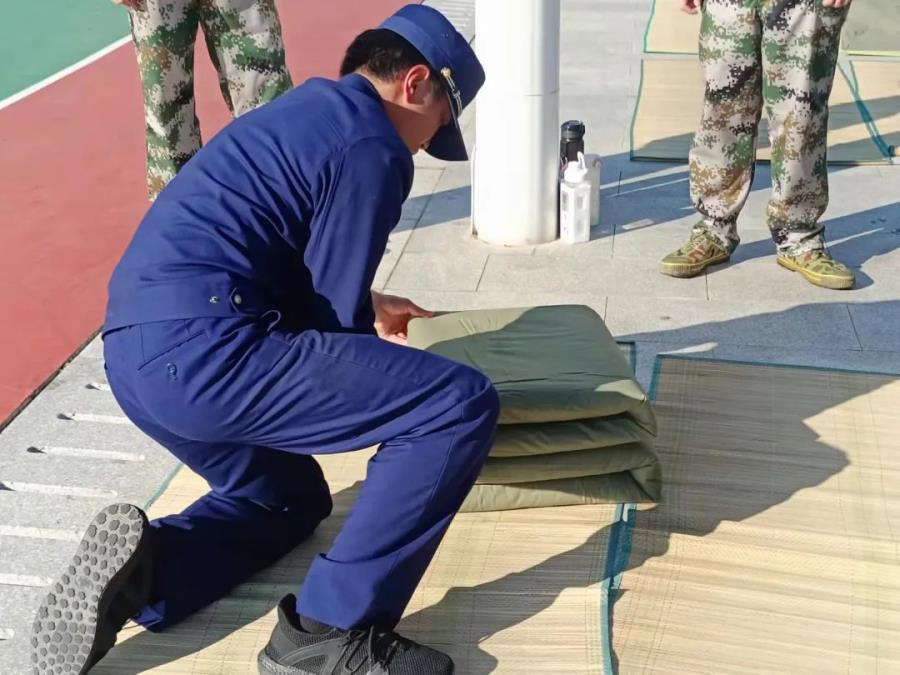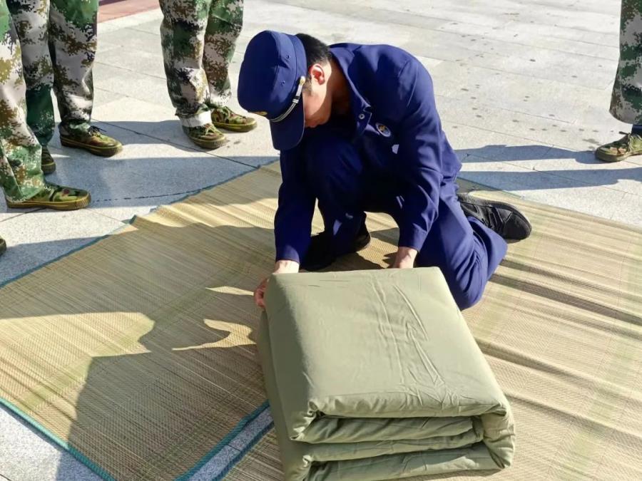 教官全程亲自示范,边操作边讲解。从如何将被子对折尺寸、折叠手法、掏平压实、叠出棱角,一步步,软塌塌的“豆腐脑”在教官的手中变成了棱角分明的“豆腐块”。