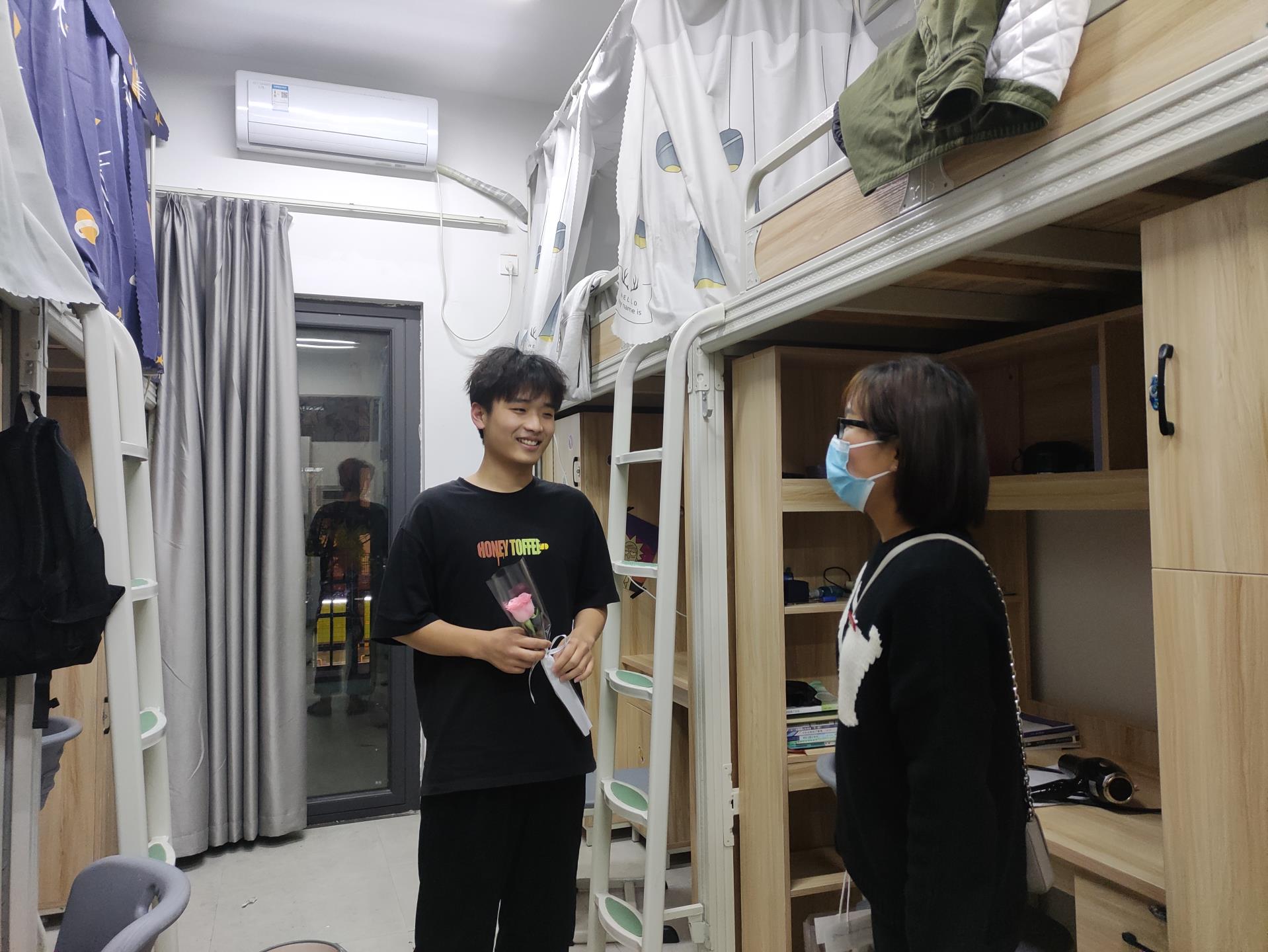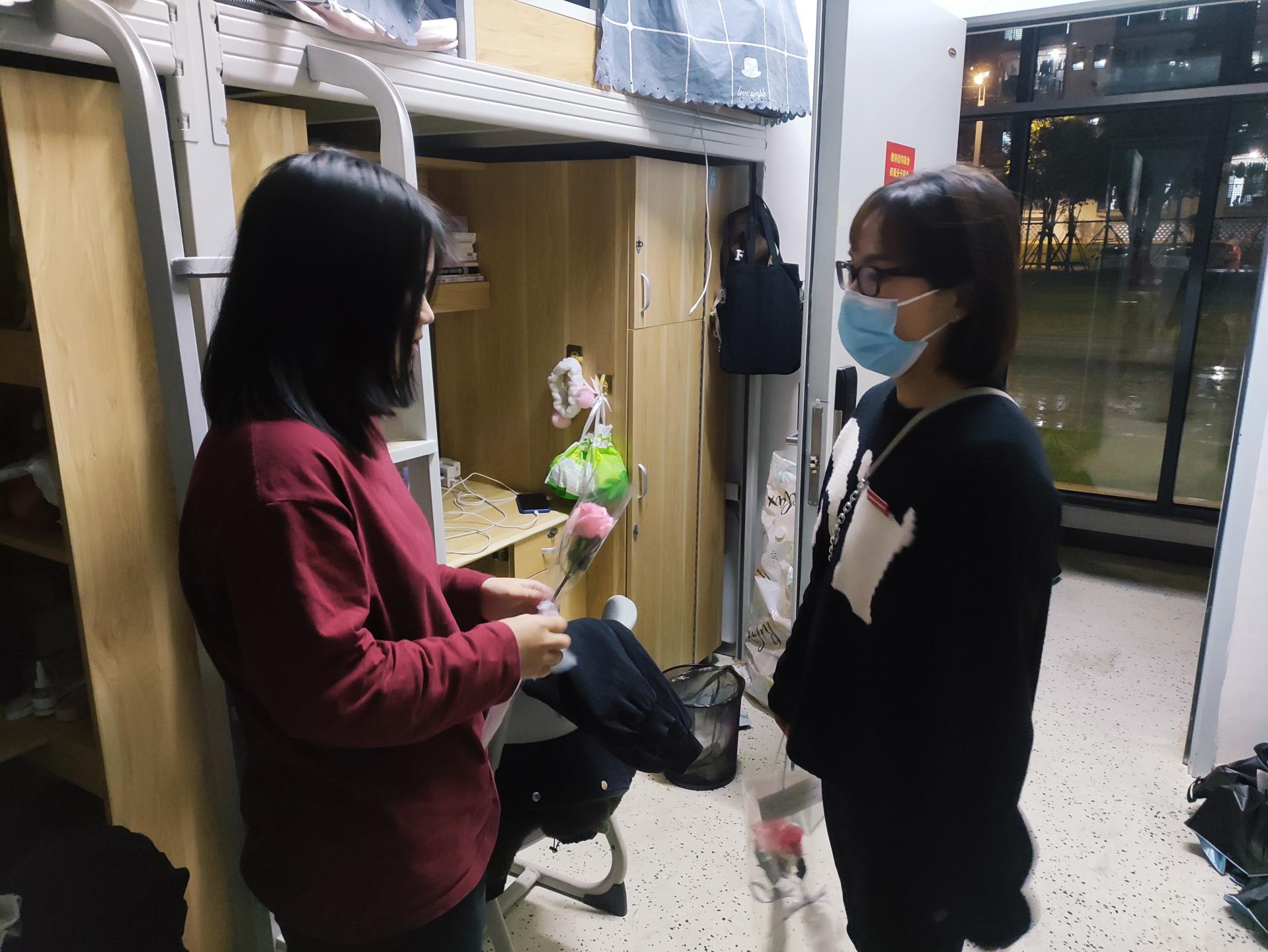 近日,我系被隔离学生经历为期14天的隔离后,又重新回到各自宿舍。解除隔离当天,化工系组织学生志愿者帮助隔离同学提行李返回宿舍。我系党总支副书记翁秀琴和辅导员们当天就前去看望已经解除隔离的同学,感谢同学们配合学院的疫情防控工作,完成14天的隔离期隔离。春风料峭,莆田气温近来急速下降,书记叮嘱同学们衣服要穿暖,要多喝白开水,以防感冒。书记还带来了一小袋的花送给每位解除隔离的同学表达系部的心意,欢迎同学们回“家”。被隔离同学看到书记也是非常开心激动,主动说起隔离期间的生活安排和老师上网课情况。