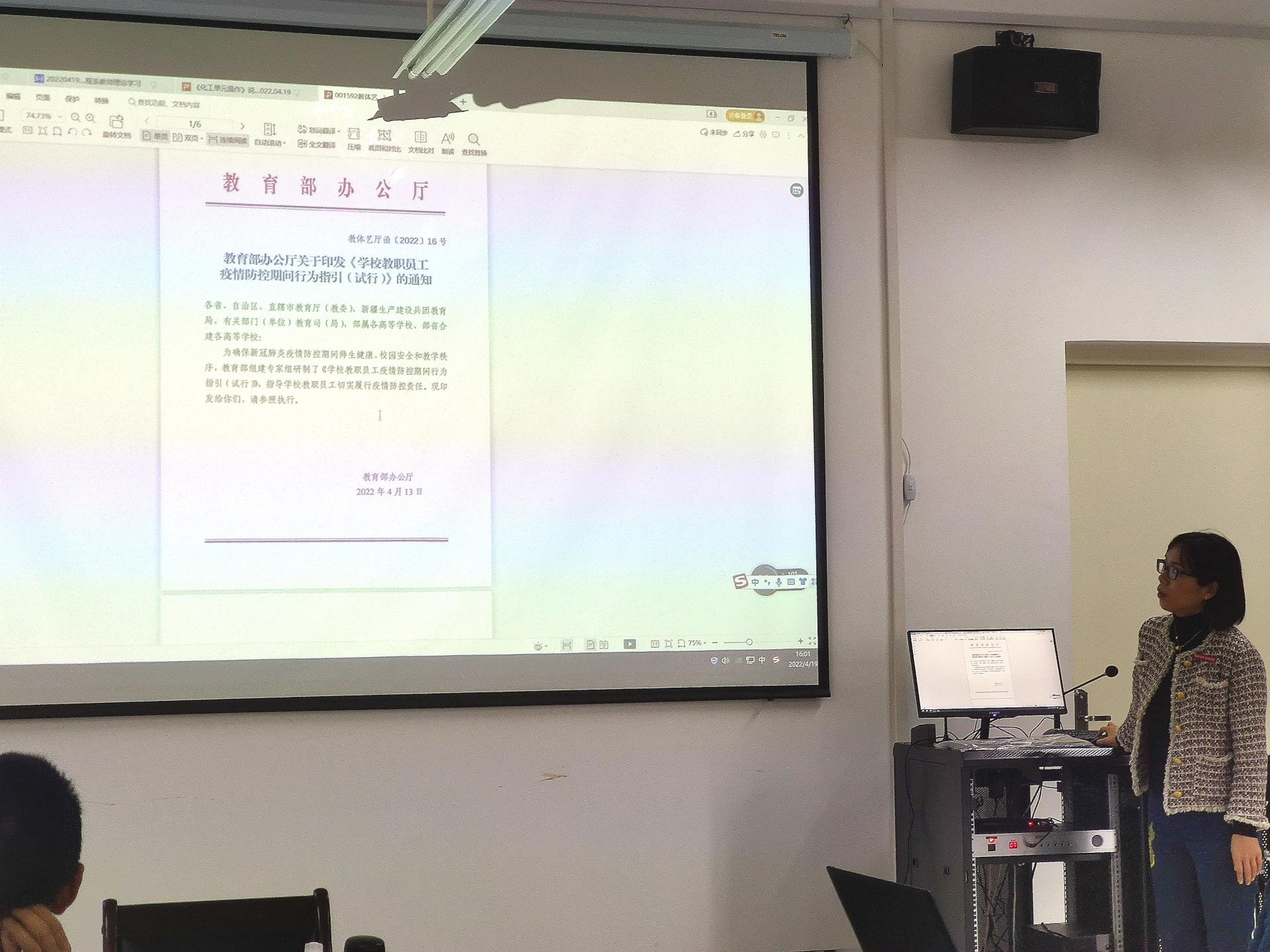 为进一步压实校园防控主体责任,有序落实常态化防控与应急处置措施,根据新型冠状病毒肺炎防控方案和当前疫情形势需要,4月19日下午,化学工程系组织全体教师在化工楼党员活动室共同学习了《高等学校新冠肺炎疫情防控技术方案(第五版)》、《学校教职员工疫情防控期间行为指引(试行)》,会议由党总支副书记翁秀琴主持。