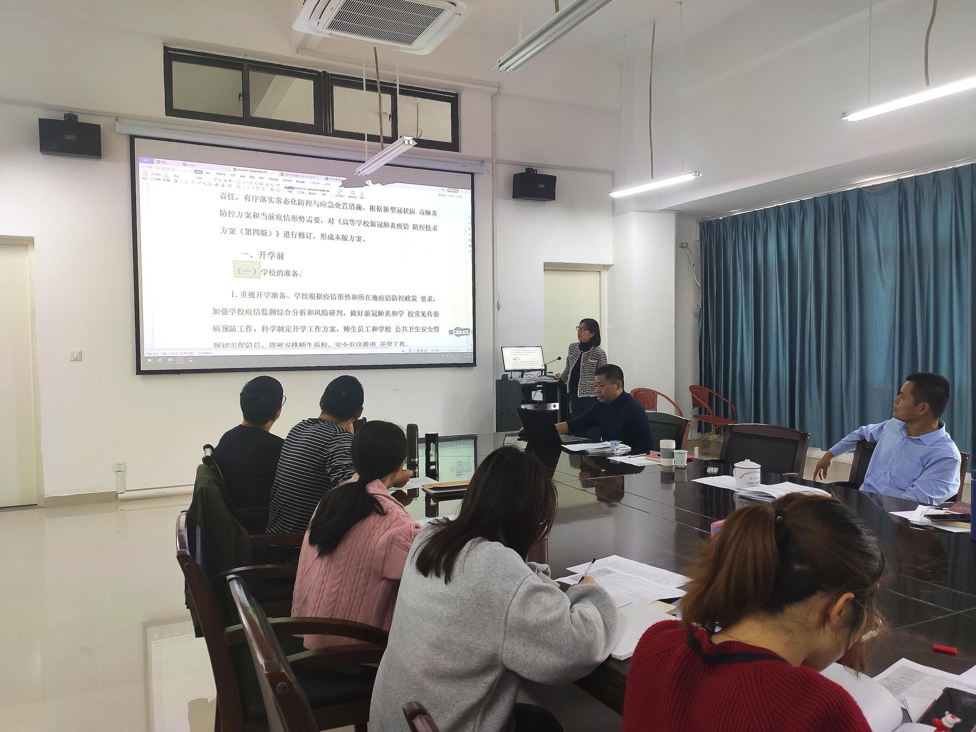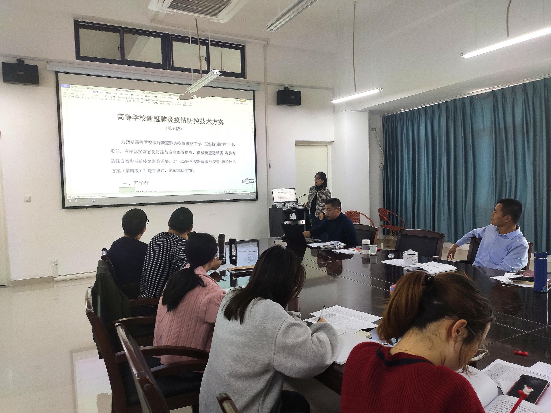 翁书记讲解了《高等学校新冠肺炎疫情防控技术方案(第五版)》、《学校教职员工疫情防控期间行为指引(试行)》的基本内容,为就做好当前和今后一段时期疫情防控工作提出要求。她指出,要认真学习宣传《高等学校新冠肺炎疫情防控技术方案(第五版)》、《学校教职员工疫情防控期间行为指引(试行)》,充分认识当前疫情形势的严峻性和复杂性,毫不松懈抓好疫情防控工作。严格落实疫情防控各项要求,教育引导师生做好个人防护,戴口罩、勤洗手、保持一米社交距离等,督促师生完成疫苗接种,做到应种尽种。做好假期值班值守,及时报送疫情信息,坚持“日报告”“零报告”制度。持续开展卫生环境整治,持续做好学生关心关爱工作,提升服务保障水平。开展户外体育运动,加强学生身体素质。