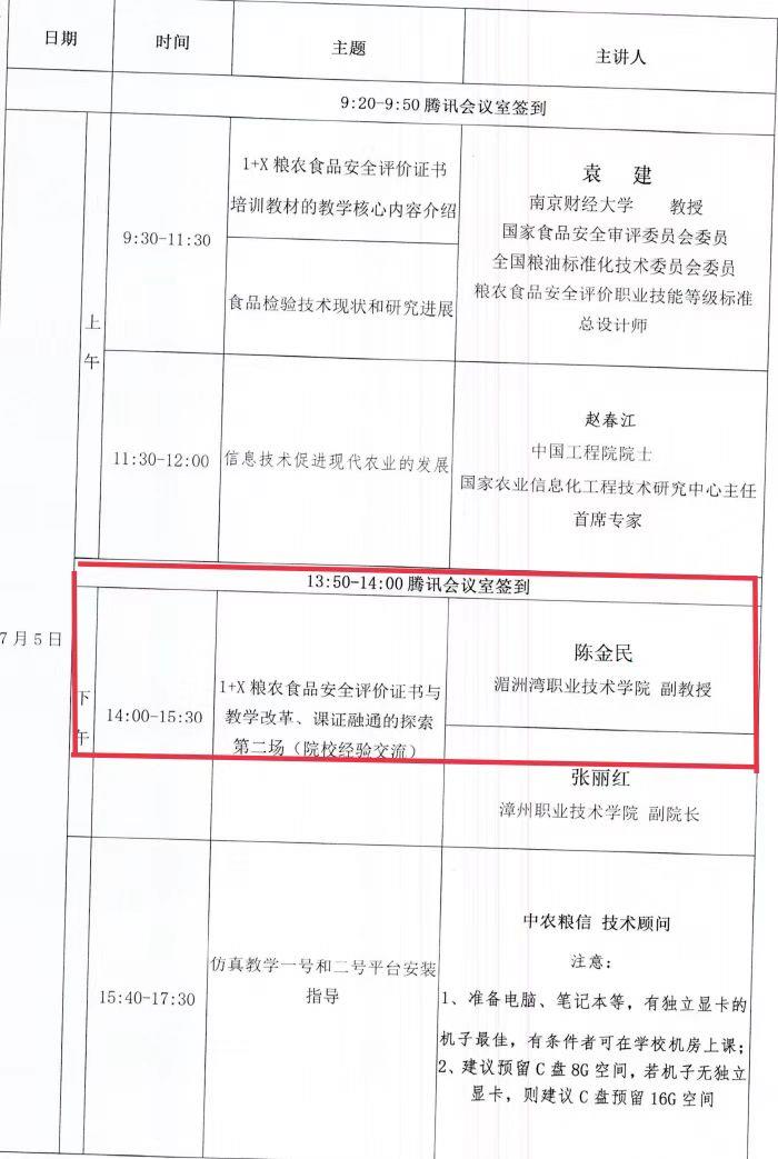 7月5日下午,化学工程系陈金民副教授应邀参加教育部1+X粮农食品安全评价职业技能等级证书第十五届师资研讨会线上经验分享。