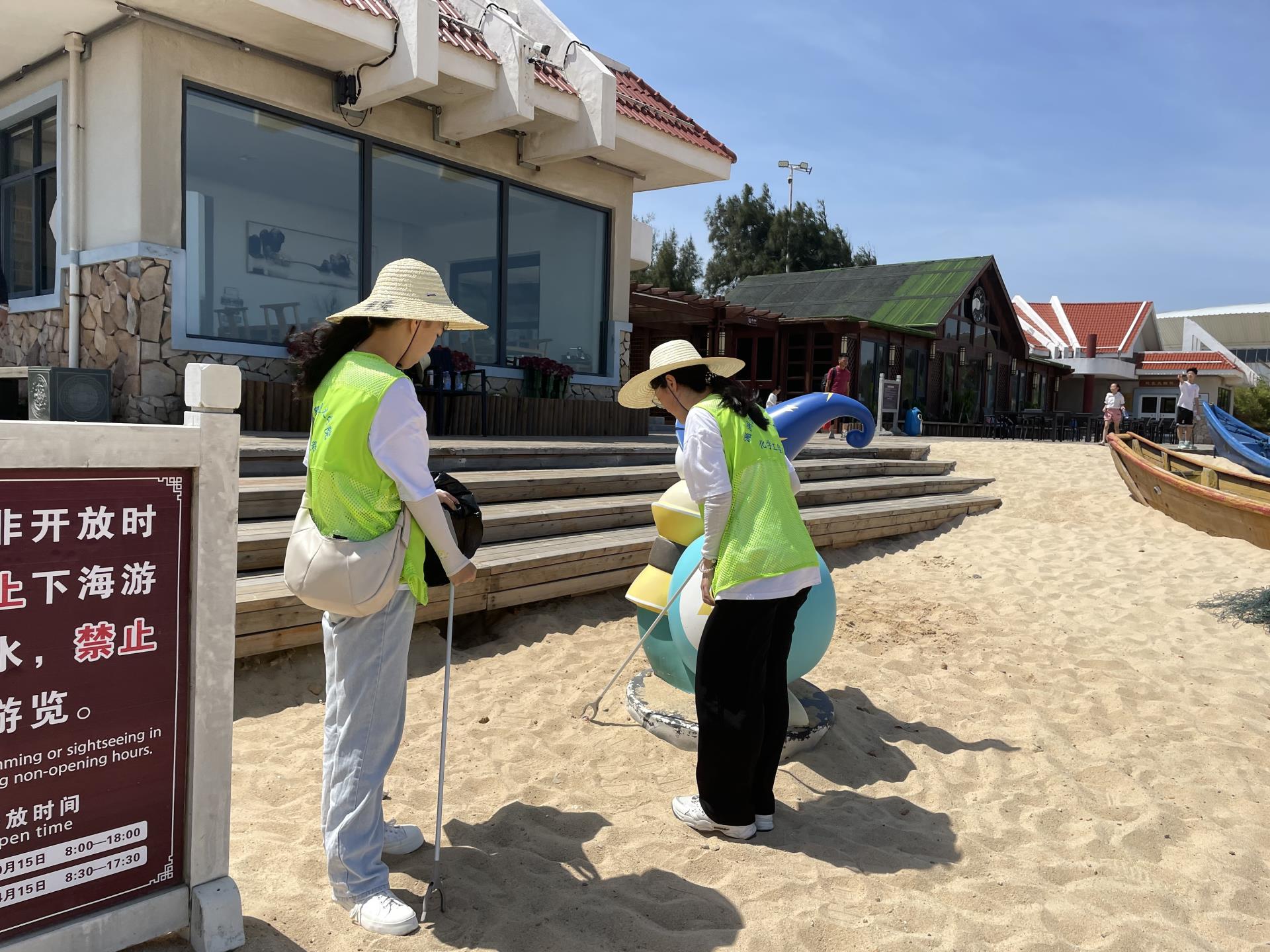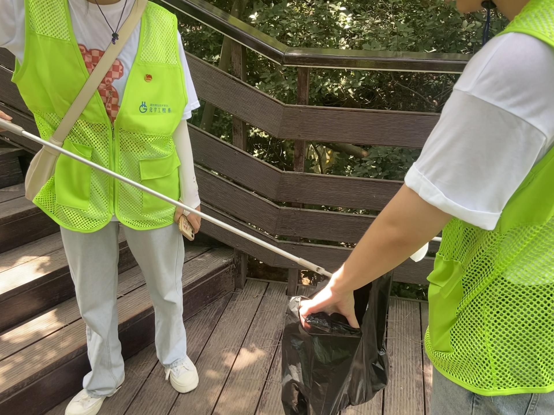最后一站实践队前往鹅尾神石园,化身“河小禹”维护周边的环境卫生,清洁家园,开展“河小禹”沙滩卫生整治。炎炎夏日,天气酷热,实践队员们穿着荧光绿马甲,拿上铁夹、垃圾袋等劳动工具,沿着沙滩开始清理。足蒸暑土气,背灼炎天光。随着白色垃圾一点点地消失,烈日下的“河小禹”身上的荧光绿也成了河道上最靓丽的风景线,漂亮的青春与绿色同荧。