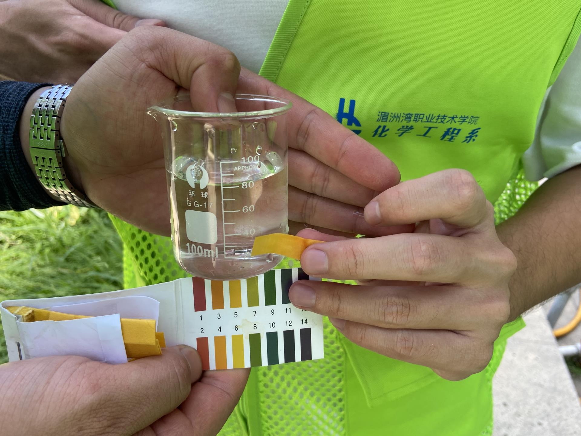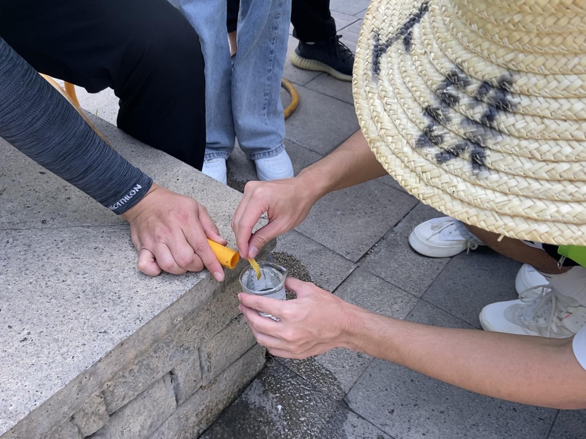 随后,实践队随机入户对湄洲岛居民用水的水质初步取样进行PH试纸检测,检测结果显示呈中性值,水质良好。为了更准确更充分检测水质,实践队用取样器取水标明取样时间带回实验室,待利用专业水质检测仪进行检测。通过此次的水质检测,让实践队成员及湄洲岛居民对水质有了更全面的了解。
