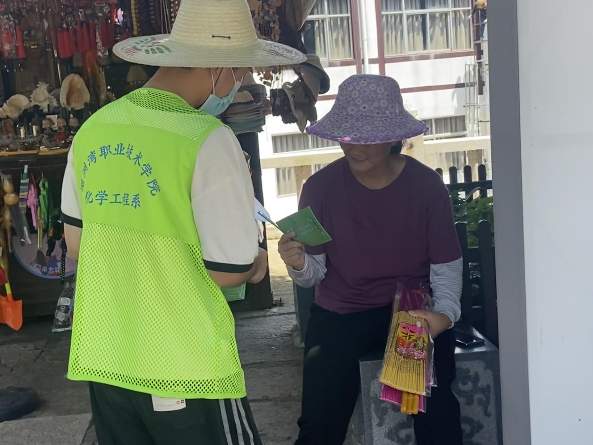 在湄洲岛管委会及湄洲岛党工委群工部的帮助下,实践队抵达湄洲妈祖祖庙门口开展生态环境保护和垃圾分类宣传。实践队成员顶着烈日,手拿宣传手册和垃圾分类宣传小扇子对过往的群众普及有关水污染防治和垃圾分类知识,并耐心的回答群众咨询疑问,细心为其解答,视乎烈日的高温热浪也抵不过实践队成员的服务热情。