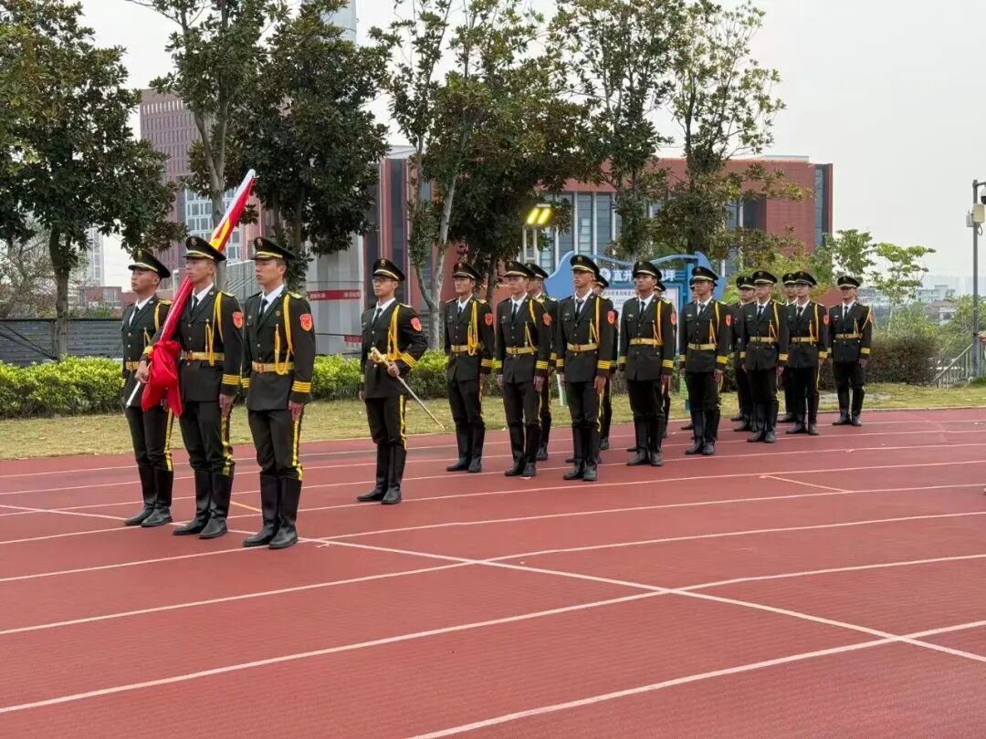 在全体师生的注目下,国旗护卫队步伐铿锵,护卫着五星红旗入场。随着《义勇军进行曲》奏响,鲜艳的国旗在晨光中冉冉升起,迎风飘扬。师生肃立行礼,歌声嘹亮,爱国情怀与职业使命感在心中交融激荡。