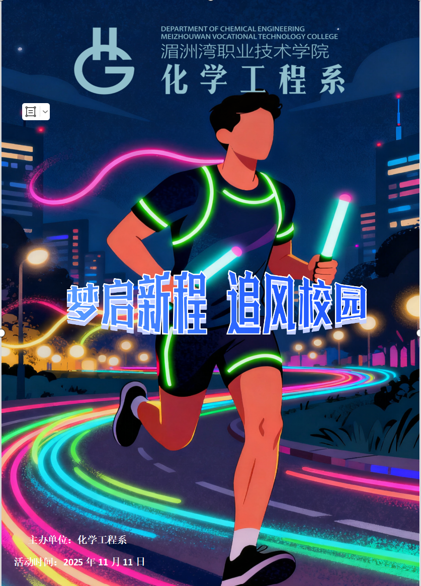 为丰富校园文化生活、激发学生运动热情,湄洲湾职业技术学院化学工程系联合院团委、“一站式”学生社区,将于2025年11月11日15:00-18:00,在图文信息中心(起点) 举办“梦启新程 追风校园”荧光夜跑活动,诚邀化学工程系全体在校生及学院2025级新生共赴活力之约。